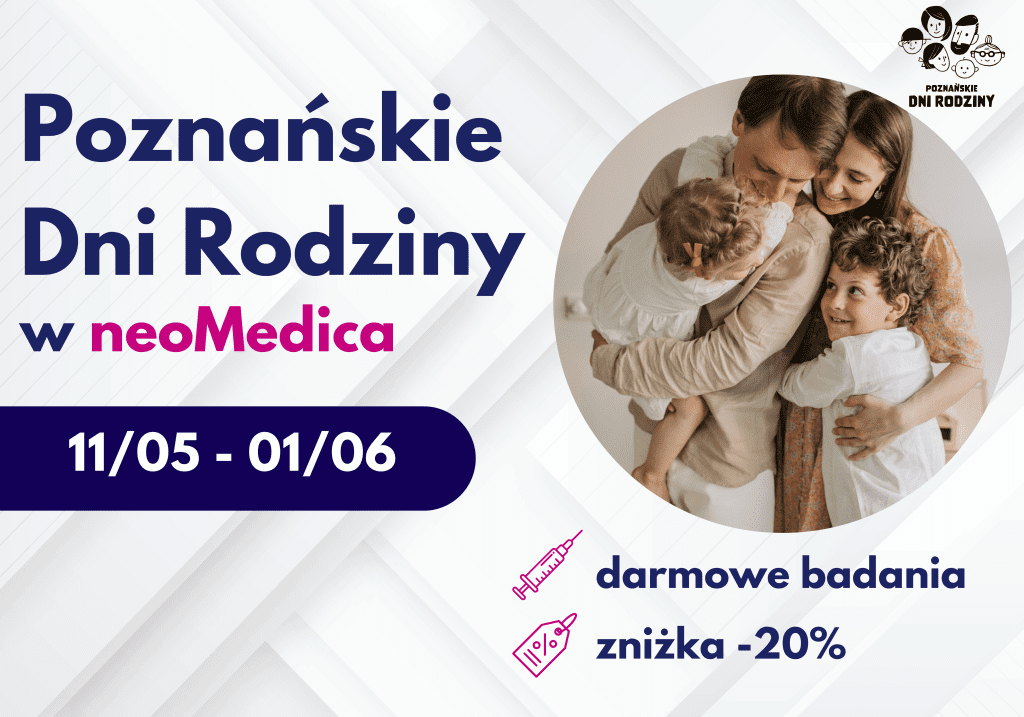 Z myślą o zdrowiu całych rodzin – zarówno dzieci, jak i dorosłych – Centrum Medyczne neoMedica w Poznaniu przygotowało wyjątkową ofertę w ramach Poznańskich Dni Rodziny 2025. W dniach 11 maja – 1 czerwca 2025 zapraszamy na: