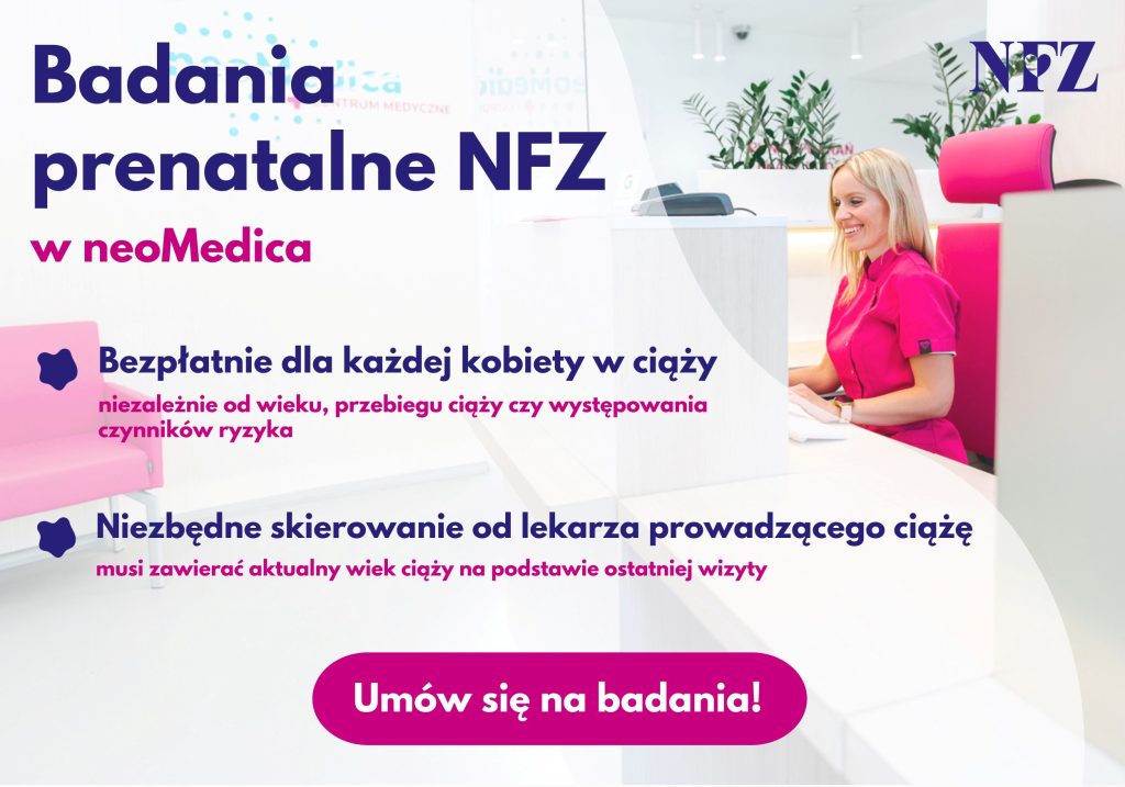 Wystarczy, że skierowanie zawiera informacje o ciąży, wiek ciążowy oraz zapis o udziale pacjentki w programie badań prenatalnych refundowanych przez NFZ. Dobrą wiadomością jest również to, że z programu może skorzystać każda ciężarna kobieta, niezależnie od wieku czy obecności czynników ryzyka – takich jak historia chorób genetycznych w rodzinie czy ciąża wysokiego ryzyka. Jeszcze lepsza wiadomość? Już teraz badania prenatalne można wykonać w Centrum Medycznym neoMedica w Poznaniu przy ul. Świetlanej 25 na Grunwaldzie.