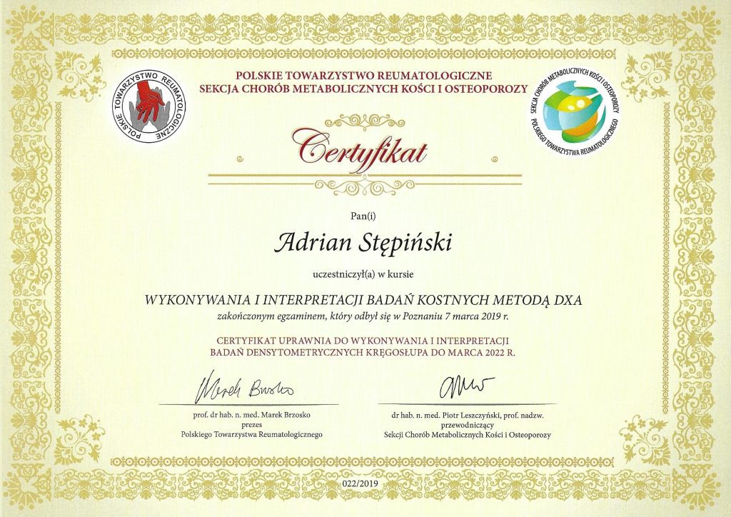 Od 2010 roku posiada certyfikat Polskiego Towarzystwa Ultrasonograficznego do wykonywania Diagnostyki USG narządu ruchu nr 376/48.