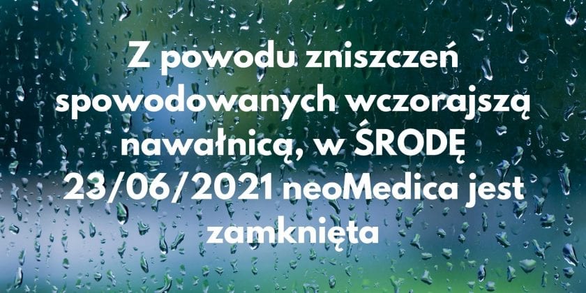 Szanowni Pacjenci, Ze względu na zniszczenia spowodowane zalaniem parteru neoMedica, podczas wczorajszej nawałnicy, w dniu dzisiejszym, tj. ŚRODA 23/06/2021 neoMedica będzie zamknięta. Mamy nadzieję, że w czwartek wznowimy przyjęcia. W środę nie będą działały telefony – z przyczyn od nas niezależnych. Przepraszamy za wszelkie niedogodności. Wszystkie wizyty postaramy się przełożyć na nowe terminy. Będziemy się […]