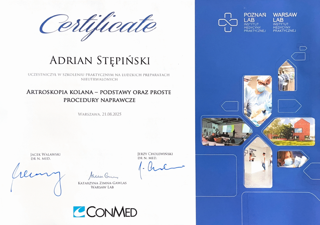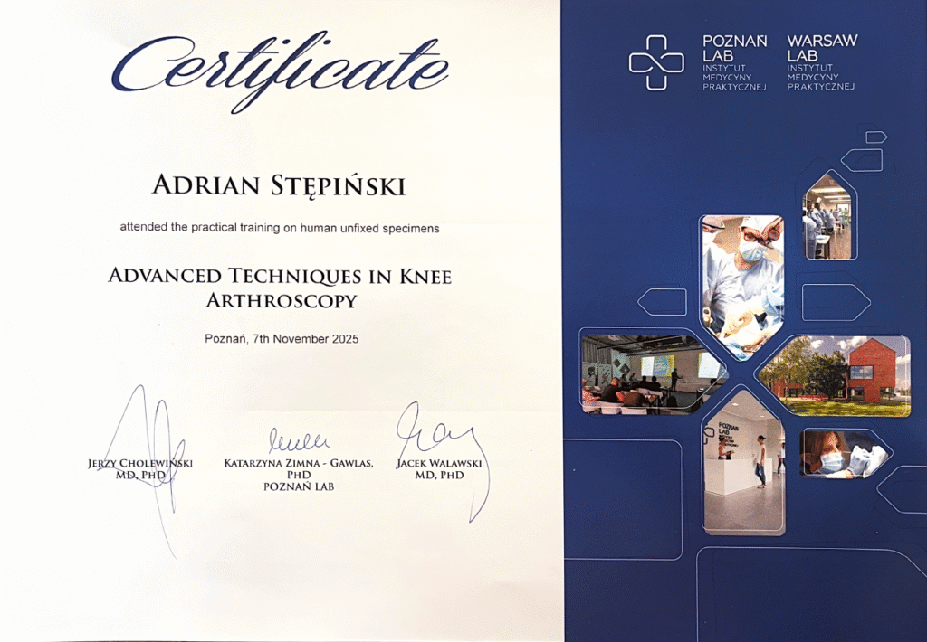 Ukończył Akademię Chirurgii Ortopedycznej (2013) z zakresu kolana – kurs na preparatach ludzkich .