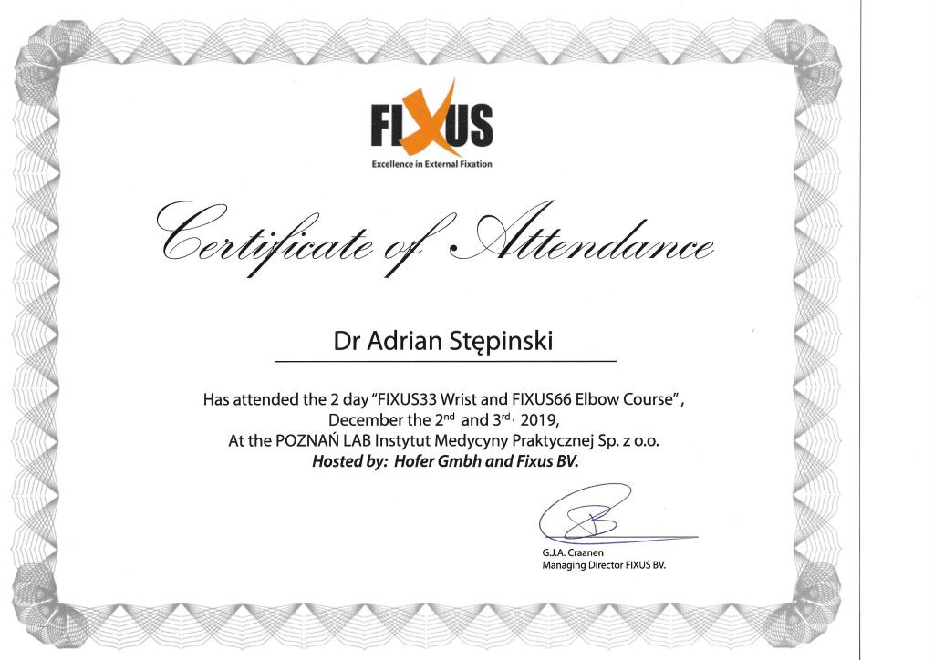 Dr n. med. Stępiński posiada certyfikaty organizacji AO-Trauma z Davos ukończenia kursu podstawowego (2011) i zaawansowanego (2012) w leczeniu chirurgicznym urazów układu kostnego .