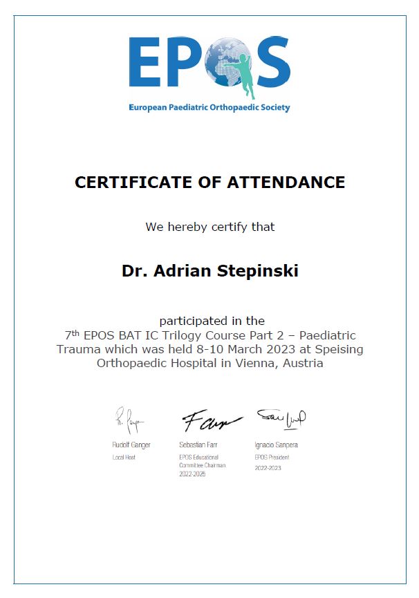 - 7th EPOS BAT INSTRUCTIONAL COURSE TRILOGY – European Pediatric Orthopaedic Society – Speising Hospital Wiedeń (2023).